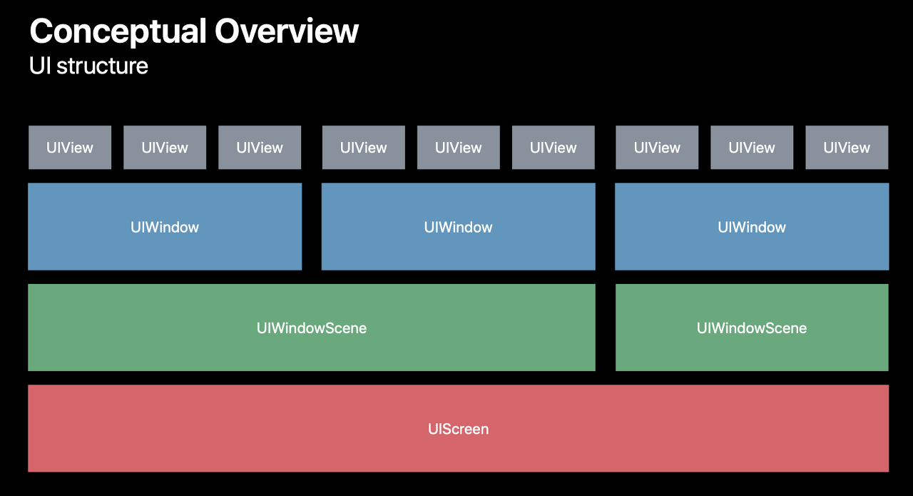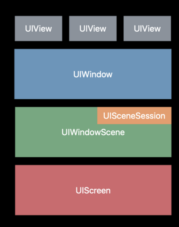 iOS13부터 멀티 윈도우가 가능해지면서 UI Structure에 UIWindowScene이라는 개념이 등장했습니다. UISceneSession이라는 개념도 함께요..!! 그럼 UIScene, UIWindowScene, UISceneSession에 대해 간단히 살펴보겠습니다 [1] UIScene - 앱 UI의 하나의 instance 또는 복사본을 의미합니다. - 아래와 같은 상황에서는 세개의 scene이 있다 라고 말할 수 있습니다. - 특정한 session과 connection 정보들로 Scene을 만듭니다.