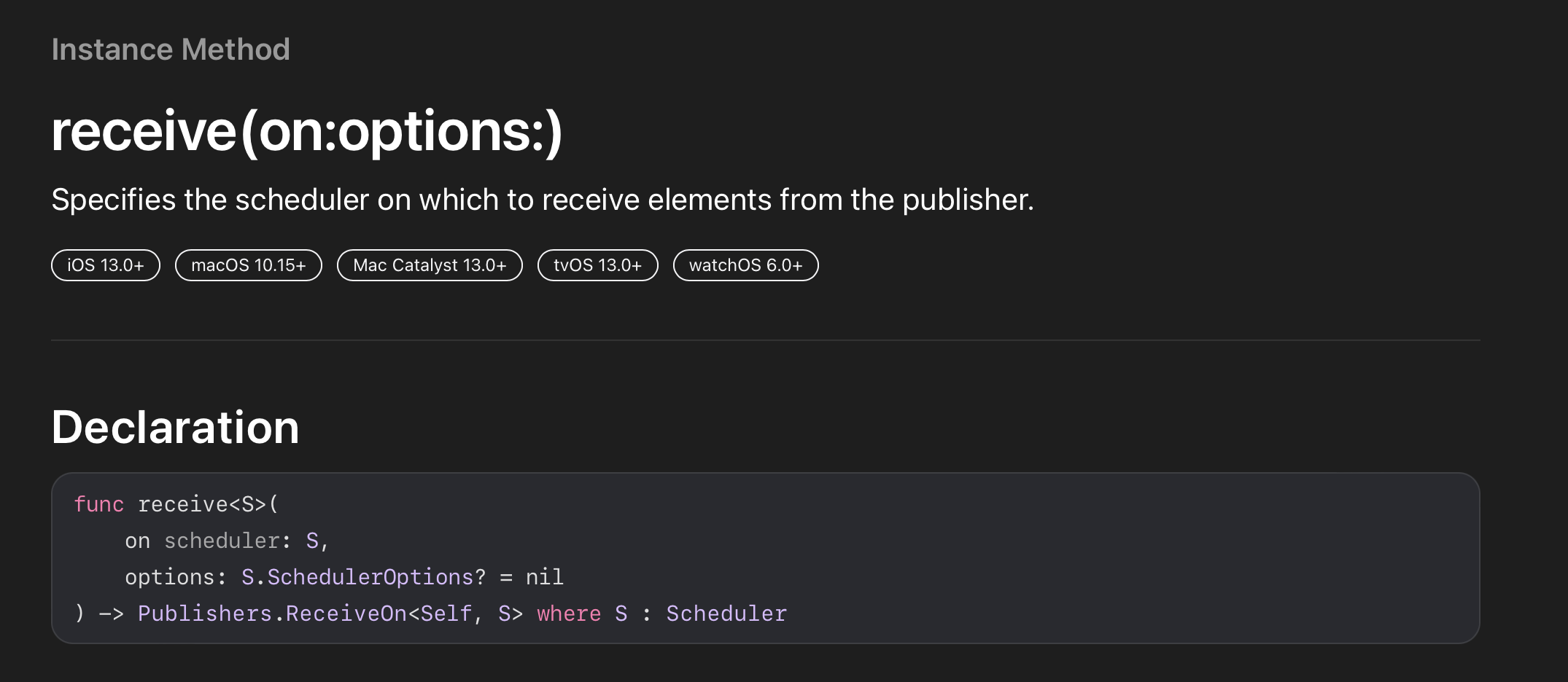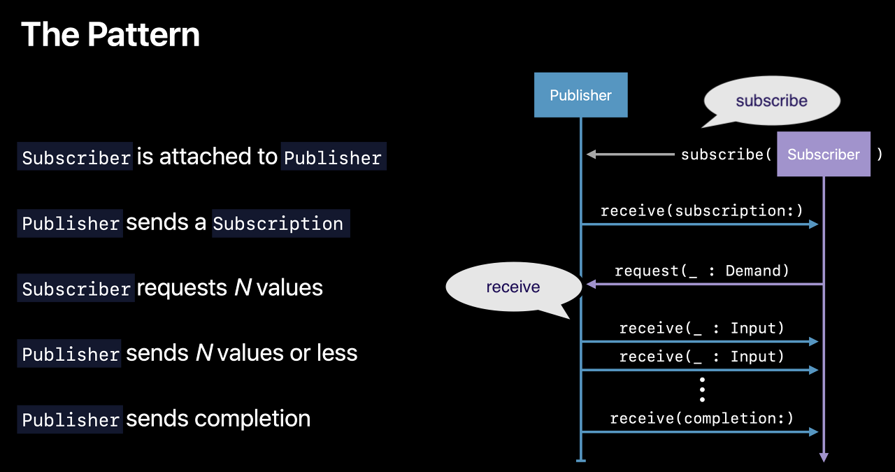 - receive: 업스트림으로부터 전달받은 요소를 다운스트림에 전달할 스케쥴러를 변경한다. → Combine에서 Publisher와 Subscriber가 데이터를 다루는 과정을 볼 때에 그림의 말풍선의 위치에서 스케쥴러가 변경이 되는게 아닌가 싶다.