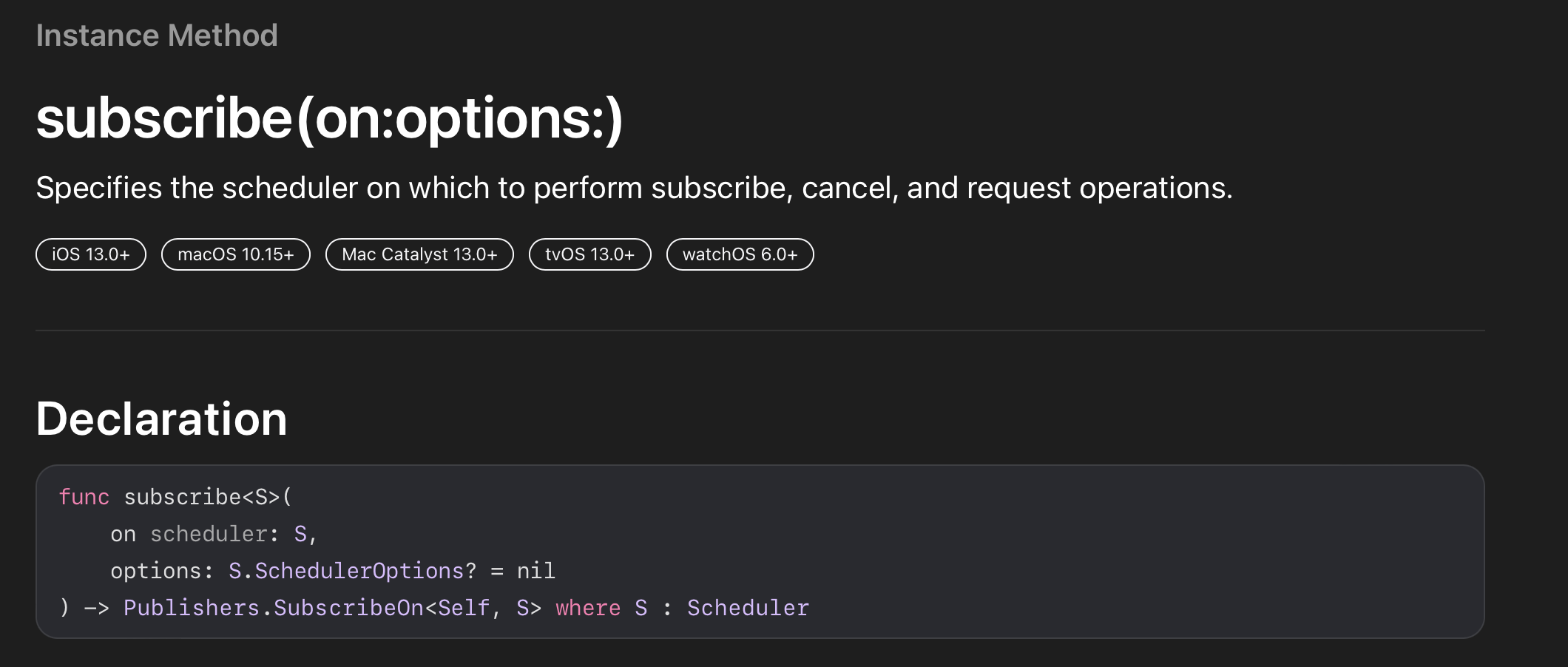 Combine에서Scheduler를 정하는 인스턴스 메소드이다. 그런데 테스트해보니 둘이 내뱉는 결과가 아예 달랐다.// 테스트를 위한 코드 var cancellable = Set<AnyCancellable>() let publisher = [1, 2, 3].publisher publisher .map{ num in print("map: \(Thread.current)") return num } .subscribe(on: DispatchQueue.global()) .sink(receiveCompletion: { completion in print("completion") }, receiveValue: { num in print("\(num): \(Thread.current)") }) .store(in: &cancellable)